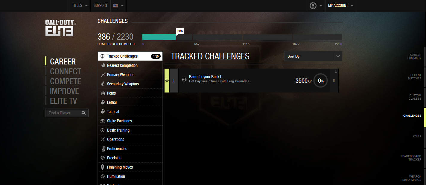 Logging in to the website you are presented with a well designed panel showing you your career summary. What is interesting is that the elite panel has a record of your stats in other series of the game, which is actually quite cool! you can look back at your stats for Call of duty 4: Modern Warfare, Call of Duty World at War, Call of Duty Modern Warfare 2, Call of Duty Black Ops and the current Call of duty MW3. If you have noted that your title/emblem card in MW3 has 4 dots under whatever title you have chosen for yourself. A few players have emblems there while others have a few or none. These dots basically represent your COD history and shows you the rank you had in either of the aforementioned editions. The editions are shown in a chronological order from left to right.